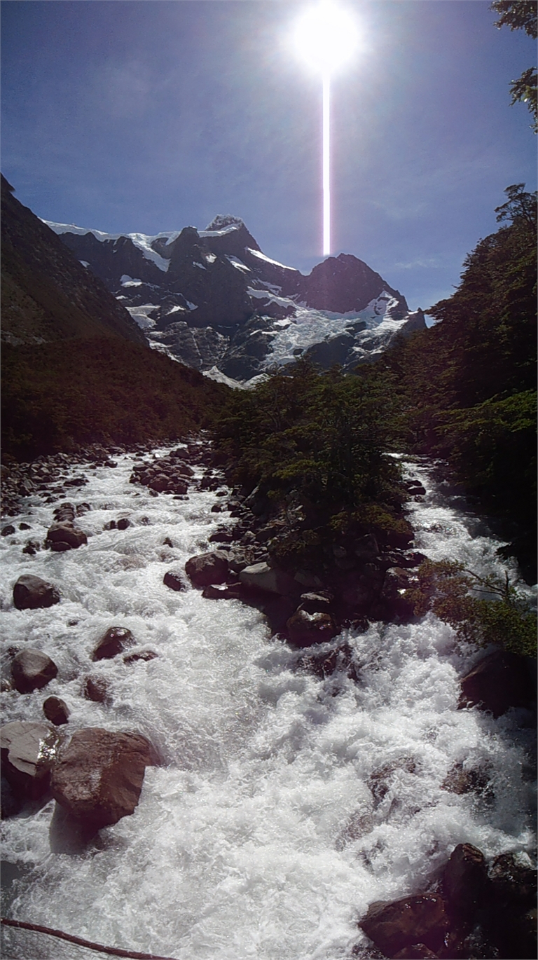 Segundo día: las mochilas pesan como plomos. Es mucho el equipo y la comida que llevamos. Andamos 5 horas. Hay que racionar el gas o no nos llegara al ultimo día. Fantástico el paisaje. Se acabó el chocolate! Lo bueno es que se puede beber agua fresquita y rica de cualquiera de los riachuelos que cruzamos.